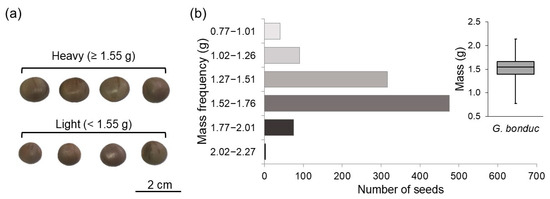 (a) Representation of the distribution of light (<1.55 g) and heavy (≥1.55 g); (b) seed classes and mass frequency in histogram with boxplot distribution for a sample of one thousand seeds of Guilandina bonduc L. (Fabaceae).