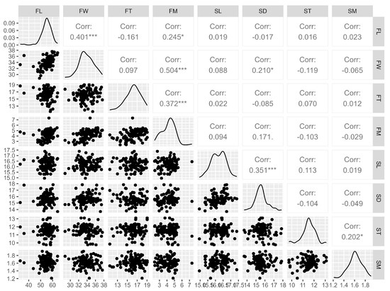 Spearman’s correlation between the physical characteristics of the fruits and seeds of Guilandina bonduc L. * p < 0.05 and *** p < 0.001. Legend: fruit length (FL), fruit width (FW), fruit thickness (FT), fruit mass (FM), seed length (SL), seed diameter (SD), seed thickness (ST), seed mass (SM).