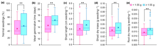 Physiological and morphological characteristics of Guilandina bonduc seedlings grown from light (<1.55 g) and heavy (≥1.55 g) seeds subjected to different levels of osmotic potentials induced by salt stress. (a) percentage of normal seedlings; (b) mean germination time; (c) shoot length; (d) shoot dry mass; (e) root dry mass. ** indicates a significant difference at p < 0.01 by the F test of the analysis of variance. × corresponds to the mean of each characteristic and ▪ corresponds to outliers.
