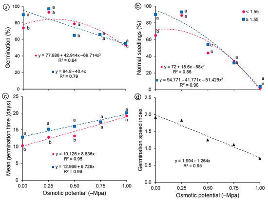 Physiological variables of light (<1.55 g) and heavy (≥1.55 g) seeds of Guilandina bonduc subjected to different levels of osmotic potential. (a) germination percentage; (b) percentage of normal seedlings; (c) mean germination time—days; (d) germination speed index. Means with equal letters at the same osmotic potential did not differ statistically from each other by the Tukey test (p < 0.05).