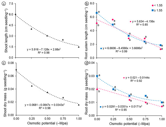 Morphological variables of seedlings grown from light (<1.55 g) and heavy (≥1.55 g) seeds of Guilandina bonduc subjected to different levels of osmotic potential. (a) Shoot length; (b) Root system length; (c) Shoot dry mass; (d) Root dry mass. Means with equal letters at the same osmotic potential did not differ statistically from each other by the Tukey test (p < 0.05).