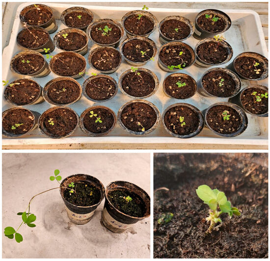 (Top): Alfalfa seedlings transferred from small trays to pots in the insect-proof greenhouse. (Bottom): On the left, a comparison is shown between an asymptomatic alfalfa potted plant negative to phytoplasma presence (left) and the symptomatic plant 4b (right) infected by phytoplasmas. On the right, a close up of the alfalfa 4b stunted plant with no major morphological modifications is shown.