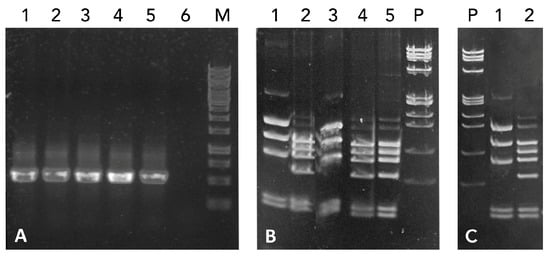 RFLP analyses on M1/M2 and fU5/rU3 amplicons with Tru1I and, in some cases, Tsp509I (Thermo Fisher Scientific, Vilnius, Lithuania) restriction enzyme provided a preliminary subgroup affiliation that allowed to perform further nested PCR using R16(I)F1/R1, R16(V)F1/R1 and R16(X)F1/R1 primers amplifying phytoplasmas in the 16SrI, 16SrXII, 16SrV, and 16SrX ribosomal subgroups [27,28]. On these latter amplicons further RFLP analyses and/or confirmatory sequencing were performed using enzymes selected according with the detected ribosomal subgroup, i.e., Tru1I for R16(I)F1/R1 amplicons, TaqI (Thermo Fisher Scientific, Vilnius, Lithuania) for the R16(V)F1/R1 amplicons and RsaI and SspI (Thermo Fisher Scientific, Vilnius, Lithuania) for the 16Sr(X)F1/R1 amplicons. Around 3–10 µL of each amplicon obtained in nested PCR were used for RFLP analyses carried out with TruI, Tsp509I and TaqI at 65 °C and RsaI at 37 °C following the manufacturer’s instructions. Restriction profiles were visualized in 6.7% polyacrylamide gel run at 140 V and result visualization was performed as described above.