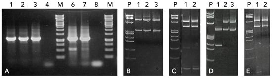 (A) Agarose 1% gel displaying the presence of bands amplified with primer pairs R16(V)F1/R1 (left) and R16(X)F1/R1 (right). From 1 to 3 and from 6 to 8, alfalfa samples; 4 and 8, H2O negative control; M, marker 1 kb hyper ladder. (B,C) Polyacrylamide 6.7% gels displaying, respectively, (B) the 16SrV-positive samples digested with enzyme TaqI and (C) the 16SrX-positive alfalfa samples digested with the enzyme RsaI. (D,E) Control strains from EPPO-Qbank collection (https://qbank.eppo.int/, 29 March 2025) (A. Bertaccini, unpublished). (D) 1, GESFY-1, German European stone fruit yellows (‘Ca. P. prunorum’, 16SrX-B); 2, AP15, apple proliferation (‘Ca. P. mali’, 16SrX-A); 3, PD, pear decline (‘Ca. P. pyri’, 16SrX-C) amplified with primers R16(X)F1/R1 and digested with RsaI. (E) 1, EY-C, elm yellows strain C (‘Ca. P. ulmi’, 16SrV-A); 2, ULW, elm witches’ broom (‘Ca. P. ulmi’, 16SrV-A) amplified with primers R16(V)F1/R1 and digested with TaqI. P, marker phiX174 DNA/BsuRI (HaeIII) cut.