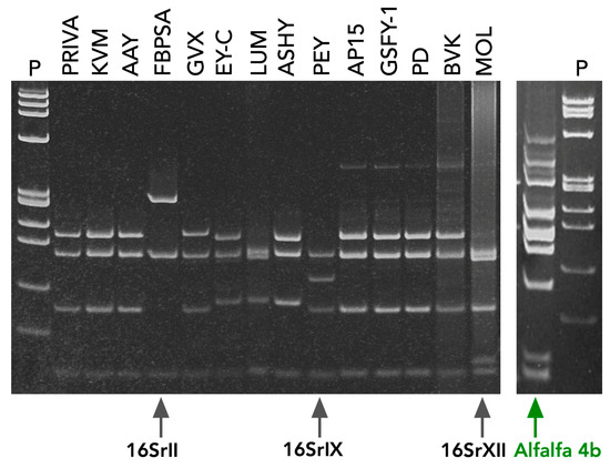 Polyacrylamide 6.7% gels displaying the RFLP profiles (on the left) of phytoplasma control strains belonging to different ribosomal groups/subgroups amplified with M1/M2 primers and digested with Tsp509I. The phytoplasma strains from EPPO-Qbank collection (https://qbank.eppo.int/, 29 March 2025) are PRIVA (‘Ca. P. asteris’, 16SrI-A); KVM (‘Ca. P. tritici’, 16SrI-C); AAY (‘Ca. P. asteris’, 16SrI-B); FBPSA (‘Ca. P. aurantifolia = citri’16SrII-C); GVX (‘Ca. P. pruni’, 16SrIII-A); EY-C (‘Ca. P. ulmi’, 16SrV-A); LUM (‘Ca. P. trifolii’, 16SrVI-C); ASHY (‘Ca. P. fraxini’, 16SrVII-A); PEY, (16SrIX-C); AP15 (‘Ca. P. mali’, 16SrX-A); GSFY-1 (‘Ca. P. prunorum’, 16SrX-B); PD (‘Ca. P. pyri’, 16SrX-C); BVK (16SrXI-C); MOL (‘Ca. P. solani’, 16SrXII-A) from Satta [29]. On the right, sample alfalfa 4b digested with Tsp509I is depicted, and the profiles recognized in this alfalfa sample are indicated by the arrow below the reference strains’ RFLP picture. The recognized ribosomal groups are 16SrII, -IX, and -XII. P, marker phiX174 DNA/BsuRI (HaeIII) cut.