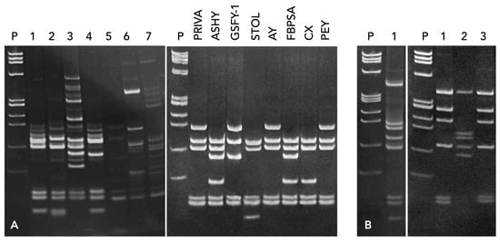 Polyacrylamide gels displaying amplicons in RFLP cut with the restriction enzyme Tru1I. In figure (A) on the left, amplicons obtained with M1/M2 primers from alfalfa samples: 1: 19a, 2: 10b, 3: 1a, 4: 23a, 5: 20a, 6: 10a, 7: 22a; on the right, the phytoplasma reference strains from EPPO-Qbank collection (https://qbank.eppo.int/ 29 March 2025) amplified with M1/M2 are PRIVA (‘Ca. P. asteris’, 16SrI-A); ASHY (‘Ca. P. fraxini’, 16SrVII-A); 3, GSFY-1 (‘Ca. P. prunorum’, 16SrX-B); STOL (‘Ca. P. solani’, 16SrXII-A); AY (‘Ca. P. asteris’, 16SrI-B); FBPSA (‘Ca. P. aurantifolia = citri’, 16SrII-C); CX (‘Ca. P. pruni’, 16SrIII-A); PEY, (16SrIX-C) from Satta [29]. In figure (B) RFLP results of the amplicon obtained using R16(I)F1R1 primers (left) on sample alfalfa 19a and (right) control strains: 1, AY (‘Ca. P. asteris’, 16SrI-B); 2, STOL (‘Ca. P. solani’, 16SrXII-A); and 3, tomato infected with ‘Ca. P. asteris’ from Mateeti et al. [13]. P, marker phiX174 DNA/BsuRI (HaeIII) cut.