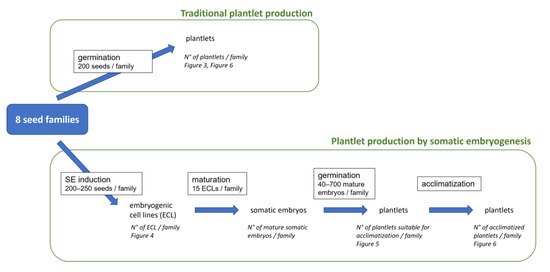 Experimental plan for traditional and biotechnological production of plantlets. Each stage of the experiment is indicated with its name and the quantity of material used (in a frame), the material produced, the results recorded (in italics) and the figure (in italics) where these results are presented. N°: number.