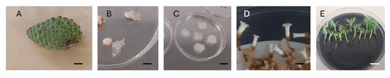 Somatic embryogenesis process in Pinus radiata: one-year old green cone (bar = 20 mm) (A), extrusion of embryogenic tissue from megagametophytes (bar = 10 mm) (B), established embryogenic cell line (bar = 15 mm) (C), 15-week-old cotyledonary somatic embryos (bar = 3 mm) (D), germinated somatic plantlets (bar = 9 mm) (E).
