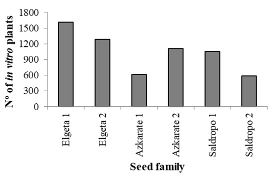 When SE was performed using 1850 immature seeds from eight mother trees, initiation rates varied greatly (Figure 4) and were below 20% for seven out of eight families (52% for Elgeta 1). Although ECLs from all seed families were subjected to maturation, it was not possible to produce somatic plantlets from two mother trees (Lastur 3 and Aixola 4). From the other seed families, it was possible to obtain somatic embryos and, after germination, 6240 in vitro plantlets from 41 ECLs. The somatic plant numbers ranged from 584 to 1608, depending on the seed family (Figure 4).