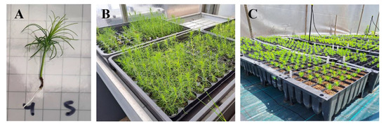(A) Somatic plant suitable for ex vitro planting (proper shoot/root balance) after germination in vitro; square = 1 cm2. (B) Acclimatized somatic plants growing in the greenhouse under controlled conditions (20–25 °C). (C) Plants produced through traditional germination (zygotic plants) growing in the greenhouse under controlled conditions (20–25 °C).