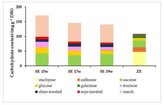 On the other hand, galactose and trisaccharides and oligosaccharides of RFOs, such as raffinose and stachyose, were found at relatively high levels only in zygotic embryos or at very low levels in somatic embryos from the latest collection date. The accumulation of these types of carbohydrates is common during the development of zygotic embryos of conifers, accounting for the main part of the carbohydrate spectrum, together with sucrose [42,54,59]. During SE, however, even if low levels of RFOs have been detected at the end of the maturation process of certain conifer species such as Pinus pinaster or Larix eurolepsis [27,40], these families of carbohydrates have been specifically linked to post-maturation treatments such as desiccation or cold storage [44,52,53,60] when they reach high values and act as strong osmotic stress protectants, enhancing the role of sucrose [61]. Because of this property, several authors have highlighted the importance of a proper RFO/sucrose ratio during embryo germination [46], but this idea is not supported by the results of this study, as zygotic and somatic embryos presented very different RFO/sucrose ratios without differences in germination.
