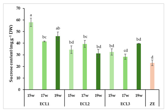 Quantitative profile of sucrose content of radiata pine zygotic embryos (ZE) or somatic embryos from three different embryogenic cell lines (ECL 1, ECL 2 and ECL 3) collected after 15 weeks (15 w), 17 weeks (17 w) and 19 weeks (19 w) on the maturation medium. Different lowercase letters indicate significant differences among the interactions between the somatic embryos from different embryogenic cell lines, zygotic embryos and collection dates at p < 0.05. DW: dry weight.