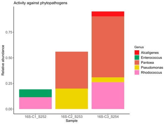 It is well established that plants recruit beneficial microorganisms into the endosphere. Moreover, vertical transmission of the endospheric microbiome from the mother plant to the offspring via the seed microbiome has been documented in the literature [57,58]. This is why the study of seed endophytic microbial communities of plants, especially those consumed by humans in raw form, represents a promising direction in the development of biological plant protection agents. The number of studies reporting on the composition of seed endophytic microbial communities, including those of lettuce (Lactuca sativa), is increasing annually [59]. It has been shown that the endospheric bacterial community of lettuce seeds primarily consists of representatives from the phyla Pseudomonadota (formerly classified as Proteobacteria) and Bacillota (Firmicutes). The relative abundance of these major groups can vary considerably: Pseudomonadota accounts for approximately 40–89% and Bacillota for 10–60% of the community composition in non-germinated lettuce seeds [60]. At the genera level frequently detected Pseudomonas, Pantoea, Bacillus, Serratia, Rahnella, Rhodococcus, Xanthomonas, and Streptomyces [61]. Our data also demonstrate a predominance of bacteria from the genera Pantoea, Rhodococcus, and Pseudomonas, with substantial representation of bacteria from the genera Candidatus Profftella and Janthinobacterium. In this study the potential beneficial properties of bacterial genera comprising the endospheric microbial community were assessed. According to published data, nearly all representatives of the endospheric microbial community in lettuce seeds exhibit a range of beneficial traits, including plant growth promotion (PGPB), suppression of phytopathogens, enhanced stress tolerance, positive effects on seed germination, and detoxification of environmental pollutants. Interestingly, sample C1 exhibited the highest values of the Shannon and Simpson diversity indices (1.84 and 0.83, respectively) despite having the lowest relative abundance of beneficial microorganisms. In this sample, the relative abundance of bacteria with activity against phytopathogens was 19%, PGPB accounted for 19%, and bacteria enhancing stress resistance comprised 7% (Figure 1, Figure 2 and Figure 3). Samples C2 and C3, which showed lower bacterial diversity (with Shannon and Simpson indices 1.2–1.1 and 1.7–1.5 times lower than those of sample C1, respectively), exhibited a substantially higher relative abundance of bacteria active against phytopathogens (56–95%), PGPB (76–95%), and stress-resistance-enhancing bacteria (64–76%). According to the literature, alpha diversity indices estimated for the endophytic bacterial community of lettuce seeds vary within the ranges of 0.3–1.0 for the Simpson index and 0.2–8 for the Shannon index [3,60,61]. It is important to note the limited scope of studies on the endophytic microbial community of lettuce seeds compared to those of crops such as rice and wheat [62,63,64,65].
