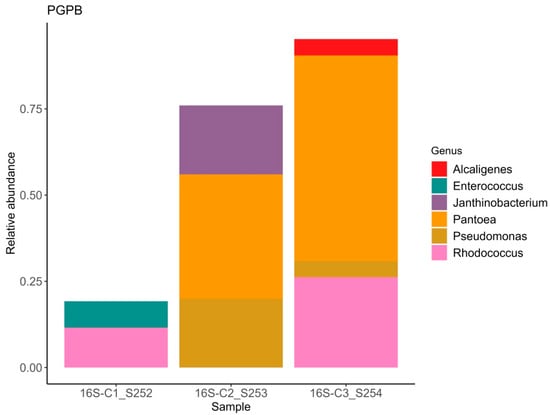Metagenomic sequencing of amplicons yielded 65,377, 73,471, and 60,108 raw reads for the 16S rRNA gene in the respective samples. After quality filtering using the filterAndTrim function, 40,515, 46,073, and 36,096 reads were retained, respectively. The DADA2 algorithm identified 6006, 6509, and 5604 unique sequences in the samples. It is noteworthy that all samples contained a high proportion of reads identified as lettuce chloroplast (39%) and mitochondrial (43%) sequences, which were removed prior to analysis. A total of 18 amplicon sequence variants (ASVs) were obtained across all samples after processing. Taxonomic composition of the bacterial endophytic bacterial microbiome of lettuce seeds is presented in Table 1. The bacterial community of the lettuce seed endosphere was dominated by representatives of the phylum Pseudomonadota (83% relative abundance), Actinomycetota (14%), and Bacillota (3%). The phylum Pseudomonadota was represented by the class Gammaproteobacteria, which included the orders Enterobacterales, Burkholderiales, and Pseudomonadales. The phylum Actinomycetota was represented by the class Actinobacteria, comprising the order Mycobacteriales. The phylum Bacillota was represented by the class Bacilli, including the order Lactobacillales. The endospheric microbial community of lettuce seeds included representatives of the genera Pantoea (32%), Rhodococcus (13%), Candidatus Profftella (13%), Janthinobacterium (7%), Pseudomonas (9%), Enterococcus (3%), and Alcaligenes (2%). The Shannon diversity indices for the three samples were 1.84, 1.51, and 1.1, respectively. The Simpson indices were 0.83, 0.76, and 0.57 for the three samples.