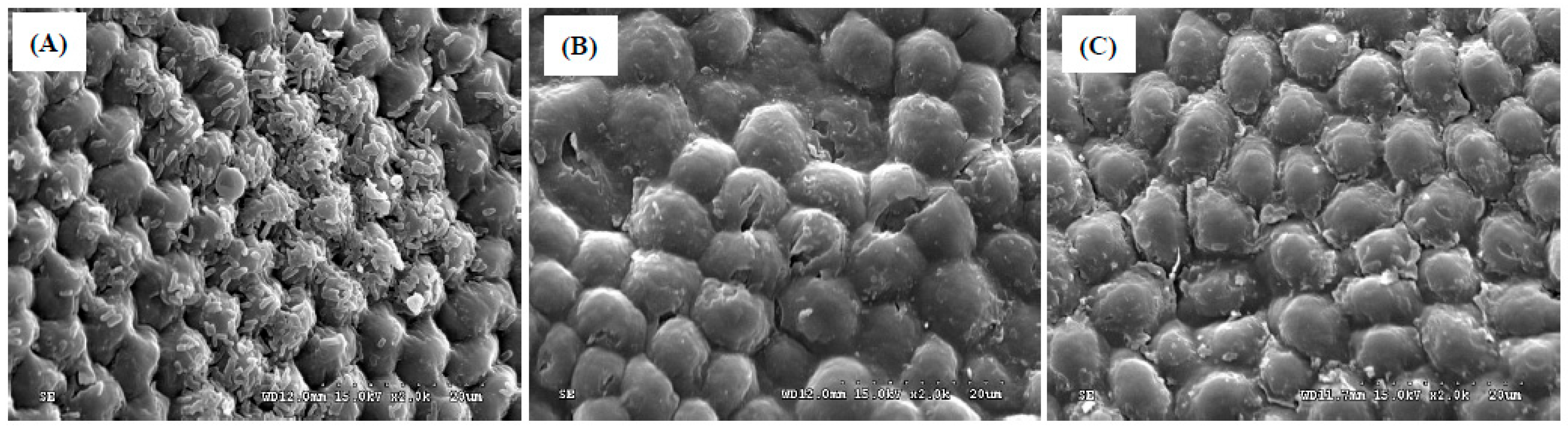 2.7. Scanning Electron Microscope (SEM) Observation