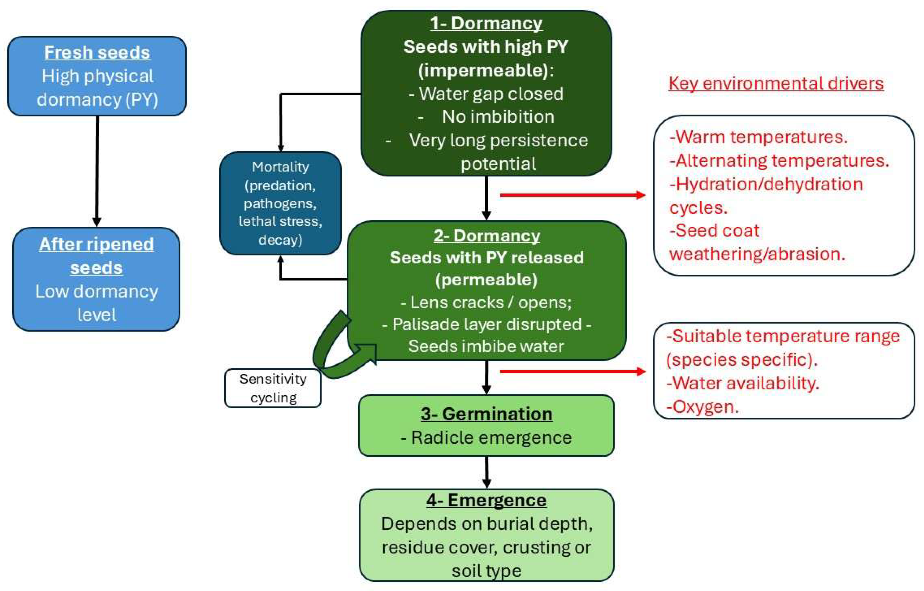 | Dormancy-release | Warm temperatures increase lens sensitivity and promote dormancy release. [10,11] Alternating temperatures accelerate release after after-ripening [6] Hydration–dehydration cycles induce structural weakening of palisade layer [12] Long-term burial weakens seed coat [26] Sensitivity cycling documented [12] | Warm temperatures enhance lens responsiveness to moisture [10,12] Hydration–dehydration cycles promote lens loosening [12] Dry after-ripening increases germination [12,23] Mechanical scarification [29] | Dry after-ripening reduces dormancy, widening the germinable temperature range [39] Scarification enables immediate high germination across temperatures [39,40] Chemical scarification (H2SO4) markedly increases germination [41] Alternating temperatures enhance germination in after-ripened seeds [39] Dormancy level decreases over dry storage time [39] |