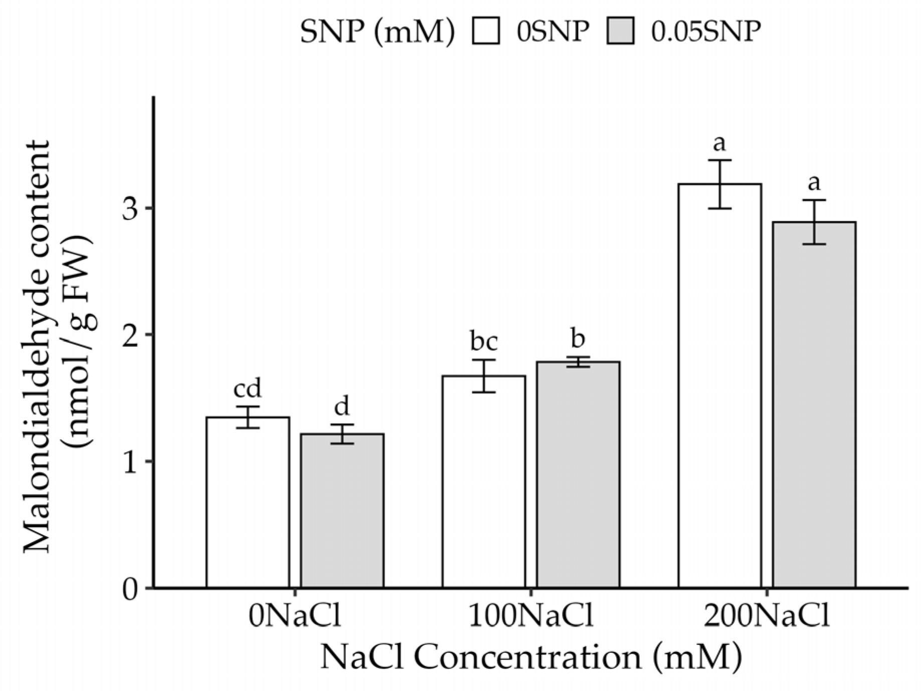 3.3. Effect of SNP on Malondialdehyde (MDA) Content in Salt-Stressed Thai Eggplant Seedlings