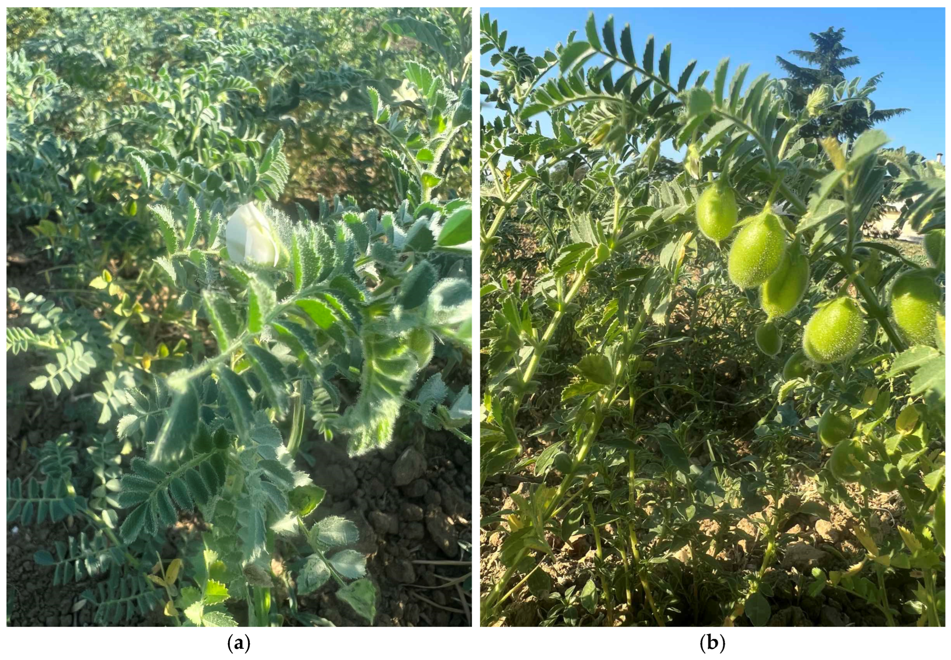 - Koskosidis, A.; Khah, E.; Mavromatis, A.; Irakli, M.; Vlachostergios, D.N. Effect of genotype and sowing period on chickpea quality, bioactive and antioxidant traits. Legume Res. 2025, 44, 1026–1031. [Google Scholar] [CrossRef]