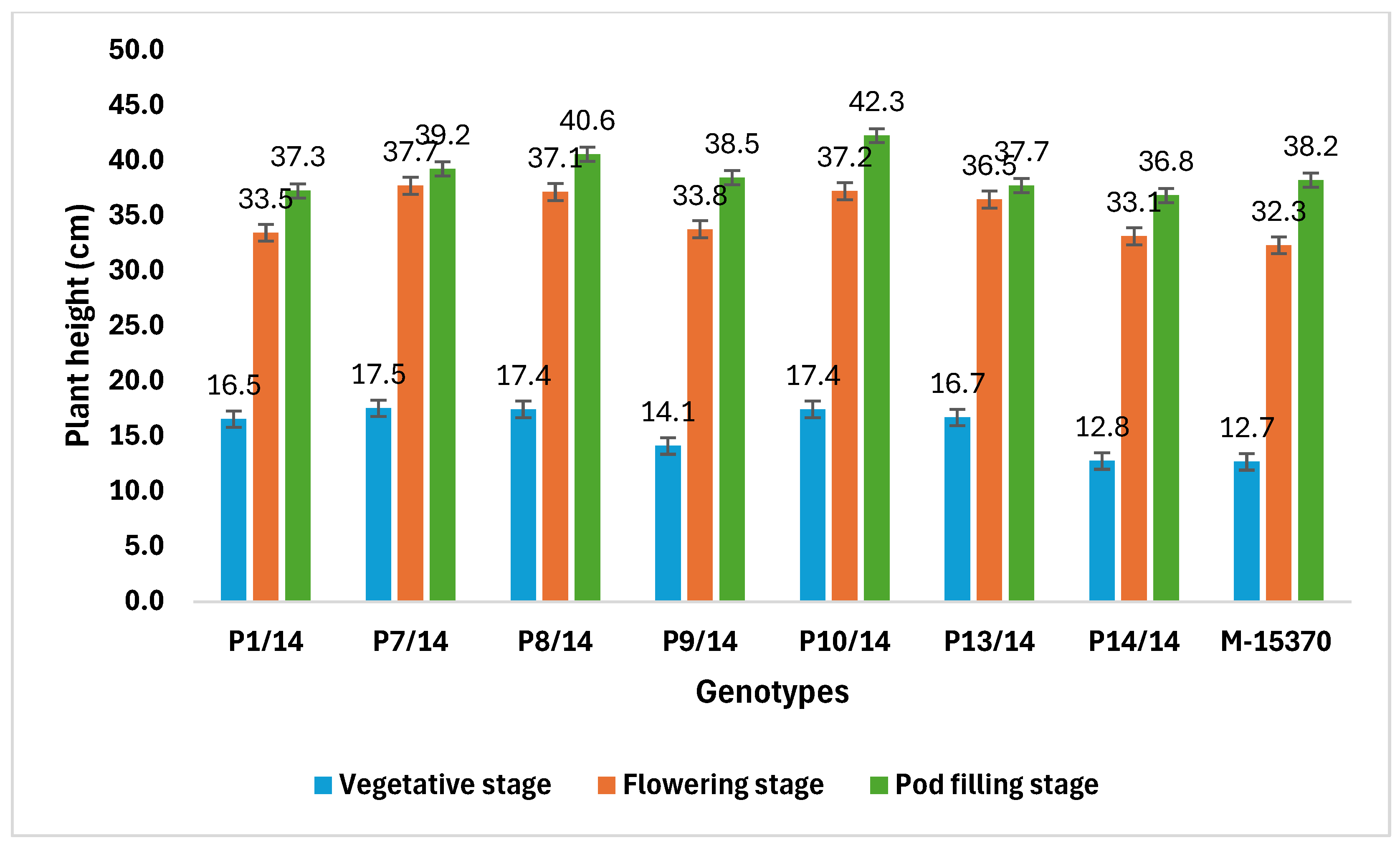 - Growth and yield components: Height at three developmental stages (cm), biomass yield (g/10 plants), seed yield (g/10 plants), and 1000-seed weight (g) were recorded.