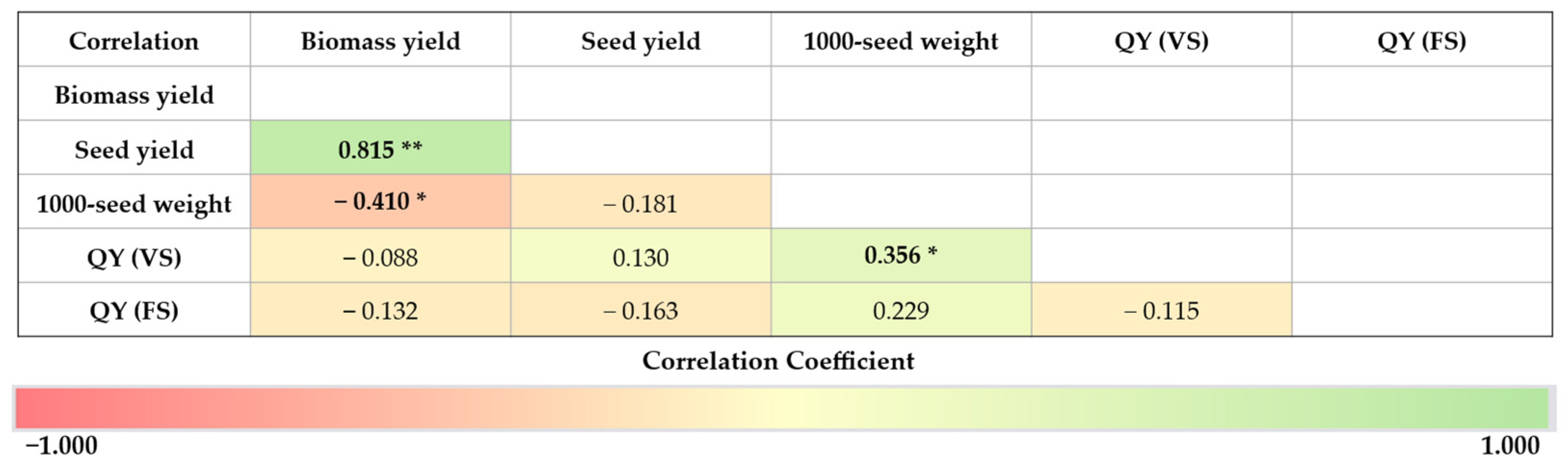 3.1.5. Correlation Coefficient (r) for Photosynthetic Efficiency and Yield Components