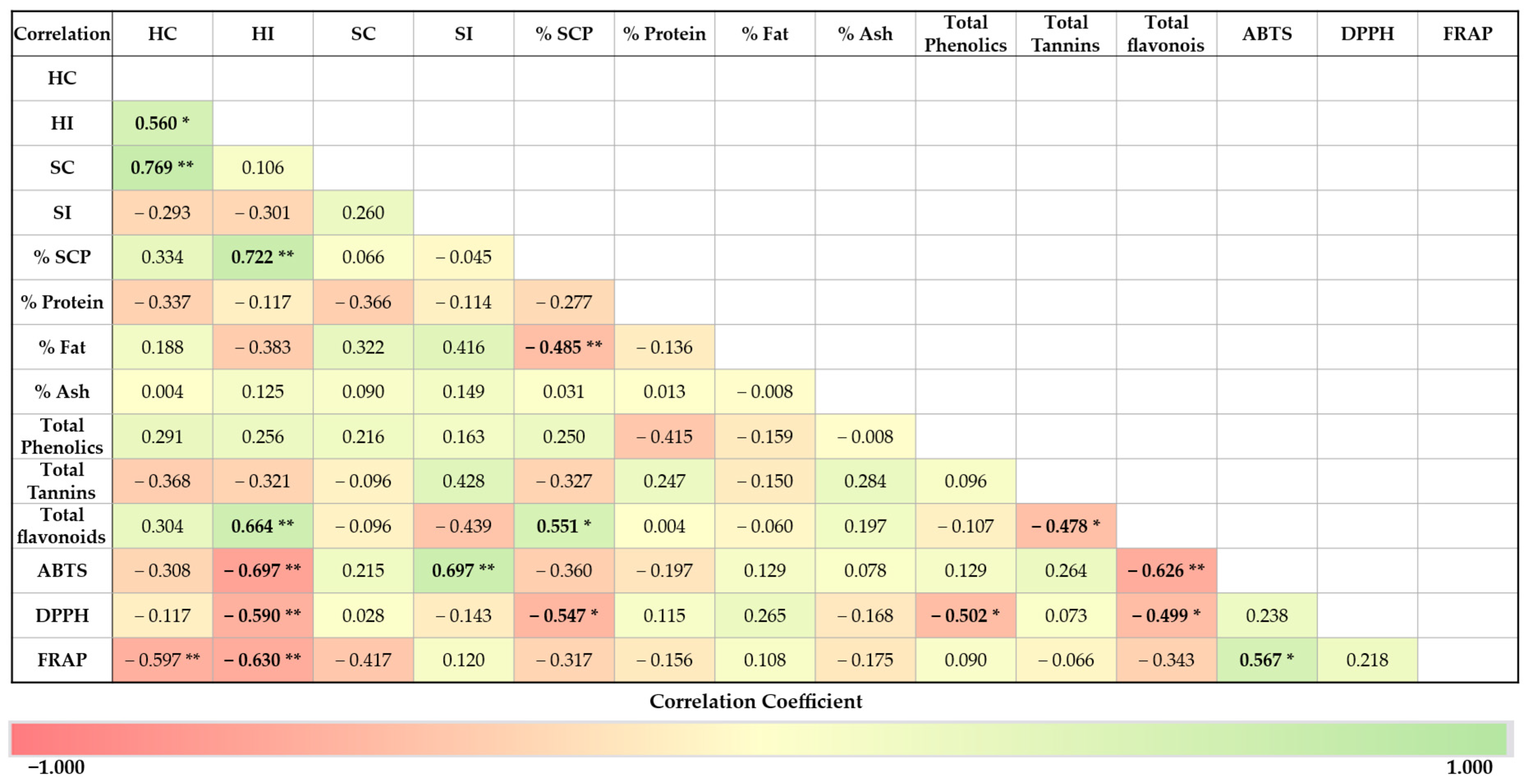 - Seed Coat Percentage (% SCP): Seeds were manually dehulled, and the weight of the seed coat was recorded. % SCP was calculated as the ratio of seed coat weight to total seed weight × 100.
