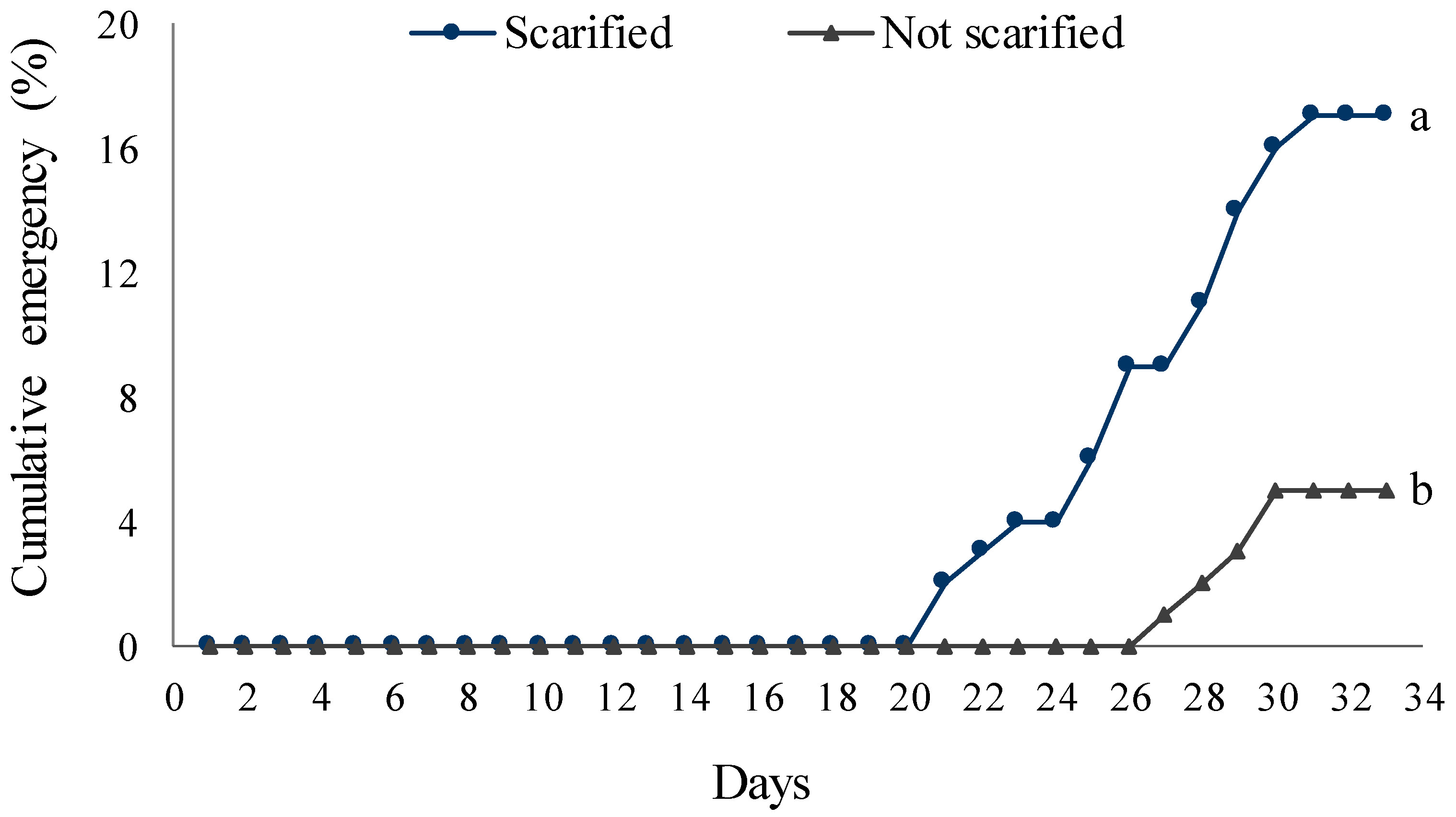 - Smiderle, O.J.; Souza, A.G. Scarification and doses of Acadian®, Stimulate® and Trichoderma spp. promote dormancy overcoming in Hymenaea courbaril L. seeds? J. Seed Sci. 2022, 44, e202244009. [Google Scholar] [CrossRef]