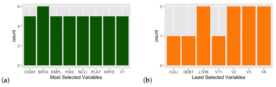 We also consider the variables which were effectively selected by different methods by making a comparison between the overall most selected variables and overall least selected ones in Figure 3. The methods were generally consistent in their selection, meaning that the more parsimonious methods chose variables that were also selected by more permissive algorithms, thus without overthrowing the underlying logic.