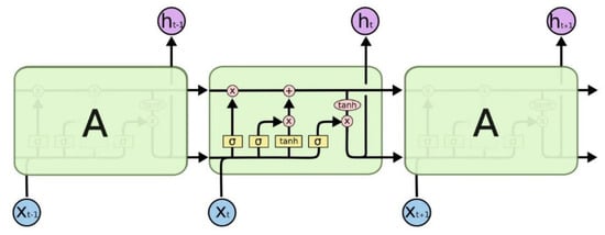 An LSTM model is a specific form of recurrent neural network (RNN), whereas (RNN) is designed to process sequence data [11,12]. Unlike the traditional neural network, the hidden layer of RNN is interconnected. This indicates that the current output is correlated to the previous output. Due to the correlation of option prices in different time, it is perfect for the research of option pricing. Experience shows that the RNN cannot ideally learn “long-term dependence”; therefore, an LSTM neural network was employed for option pricing. A typical LSTM scheme is shown in Figure 1.