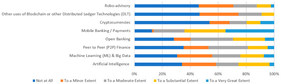 Mobile banking is one of the trends in which the difference in the implementation based on the geographical location is not significant, as the one-way ANOVA shows. This could be explained by the current usage of smartphones globally, as the infrastructure for this technology already exists widely. However, other trends which require new infrastructure and R&D—such as AI or DLT-based technologies—are not as popular, which explains the significant difference in the implementation from one region to another. Table 3 shows the one-way ANOVA test result shows the significance of technological trends.