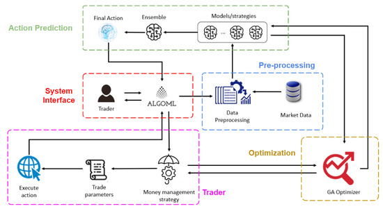 With reference to Figure 1, the general process flow of the system starts out at the System Interface module. Traders will use the UI to ask AlgoML to provide a recommended action for their desired Forex pair. Upon receiving the request, the system proceeds to the Pre-processing module, where market data is harvested through broker websites and processed accordingly. The processed data is then passed into the Action Predictor module, specifically into the various models/strategies included within it. Each model/strategy takes in the processed data and outputs their predicted action to take. The predicted action from each model/strategy is then collected into the ensemble model to obtain a single final predicted action. The predicted action to take will then be reflected to the user via the System Interface UI. Here, the user can choose to instruct AlgoML to execute the predicted action on their behalf. If so, the system will proceed to the Trader module, which takes in the predicted action signal and uses an included money management strategy to execute the most optimal course of action to take. The result of the actual action taken by the Trader module will be reflected back to the user through the UI. The Optimization module of the system helps to optimize parameters for strategies within the system such as the money management strategy in the Trader module, and those used in the Action Predictor module. More details about how each module functions is explained in Section 3.2, Section 3.3, Section 3.4, Section 3.5 and Section 3.6 below.