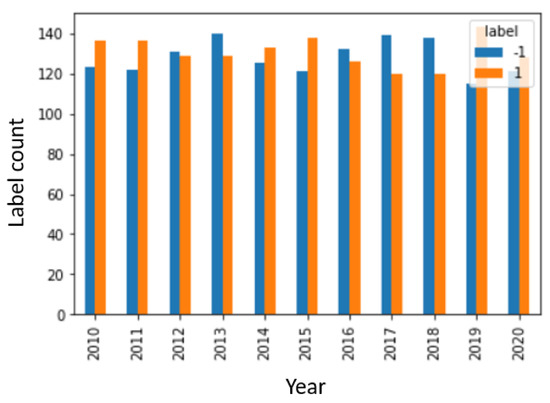 After generating the labels, it is important to check for class imbalance within the data. This is to prevent biased performance of the trained model towards a certain set of labels [25]. The presence of class imbalance can be observed by checking the labels distribution for each year as shown in Figure 2. A good class distribution would have a relatively similar number of labels for each year and overall total for the entire time range as well, which can be observed from the graph. As such, class imbalance is not expected to be major factor negatively affecting the performance of the trained supervised models.