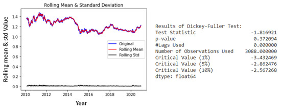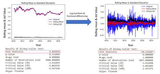 Times series data is different from independent and identically distributed (IID) data. The conventional preprocessing methods cannot be applied directly to this data. Furthermore, financial price data follows a stochastic process which adds a further level of complexity. As such, it would be extremely difficult to model or forecast the data [26,27]. Hence, when dealing with time-series data, it is recommended to make the data stationary before passing it into the model for training and testing. Stationary data is where the mean, variance and autocorrelation structure do not change over time, which means that there should be no clear trend observed within the data [28]. The motive behind making data stationary is that ML models learn based on particular patterns. Due to regime changes or external factors, the market changes and so do the patterns in the data. As such, predictive results are going to be worse, as the ML model is unable to generalize well to this change in pattern. To test whether a time-series is truly stationary or not, the augmented Dickey–Fuller (ADF) test is utilized [29]. The main objective of the test is to reject the null hypothesis that the data is nonstationary. If the null hypothesis can be rejected, it means that the data is stationary. The test consists of a Test Statistic and some Critical Values for different confidence levels. If the ‘Test Statistic’ is less than the ‘Critical Value’, then the null hypothesis can be rejected. When applied to the raw OHLCV data, the results as seen in Figure 3 show that the data is indeed nonstationary.