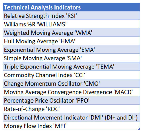In real world trading, traders do not just depend on analyzing OHLCV signals to predict market movement. Instead, they also employ the use of technical indicators, which are heuristic or pattern-based signals produced by the price or volume data. Examples of commonly used technical indicators include moving average (MA), Bollinger bands (BB) and Heikin Ashi candles. Some notable technical indicators that are used to train the ML models in the system are seen in Figure 5, which have been used in other research works for Forex trading as well [31,32]. The chosen technical indicators are mostly oscillators and trend-based financial time-series filters which are used by [32]. In those studies, different intervals are used for the technical indicators (3, 7, 14 and 20 days), which are commonly preferred by short-to-medium-term traders. The conclusion drawn from [33] reveals that using long-horizon forecasts potentially contributes to negative prediction results and short-term results in better prediction. This is based on the fact that out of the 39 studies, 27 papers used both middle-term and short-term predictions. The technical indicators are generated using Python packages finta [34] and pandas-ta [35].