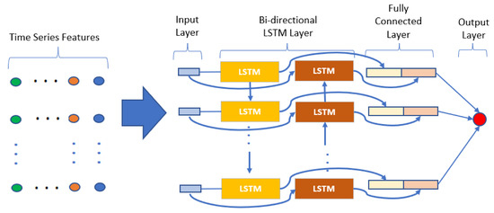 For this study, the bidirectional LSTM from [50] is utilized. This type of bidirectional recurrent neural networks connects two hidden layers of opposite directions to the same output thus it can learn from both the forward and backward time dependencies. With this form of generative deep learning, the output layer can get information from past and future states simultaneously. In a bidirectional LSTM, each unit is split into two units having the same input and connected to the same output. One unit is used for the forward time sequence and the other for the backward sequence. The common output does an arithmetic operation such as sum, average or concatenation on both the units. Bidirectional LSTM is thus useful when learning from long spanning time-series data [51]. This type of bidirectional LSTM was also used in other research works for stock market closing price prediction [52]. The general bidirectional LSTM framework is illustrated in Figure 8.
