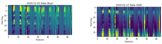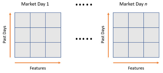 The input Forex data was shaped into a sequence of two-dimensional data (past day and features) as shown in Figure 9. The features consist of OHLCV and technical indicators data. In this study, 30 days of past-day data was used as the look-back input. This value was selected based on a study where the authors created 30 days of sample chunks by sliding window over time series to predict the value of the 31st day [53].