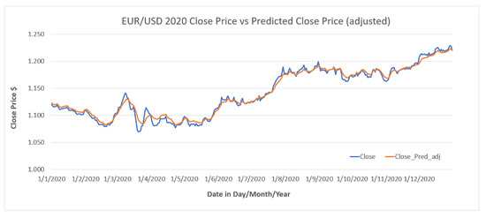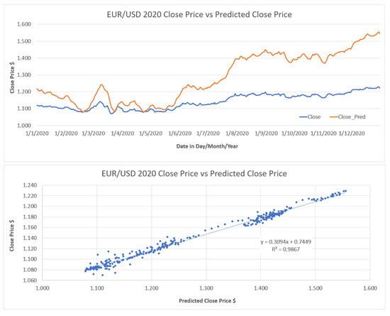 The BILSTM model was used as a regression model to predict the next day close price to obtain the Forex close price movement direction, the result is then converted to a binary Buy or Sell signal. An offset was observed between the predicted close price and the actual close price but in a linear relationship as shown in Figure 11 below.