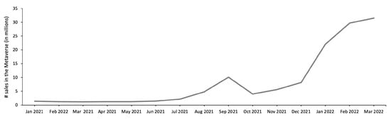 Ethereum blockchain. By March 2022, there have been more than 30 million sales of Metaverse goods and services. These figures illustrate that the market for Metaverse products is already substantial, and the market growth rates have dramatically increased recently.