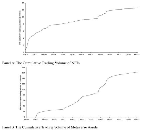 Figure 3 show the cointegration of NFTs and Metaverse activity. Panel A shows the cumulative trading volume (in US