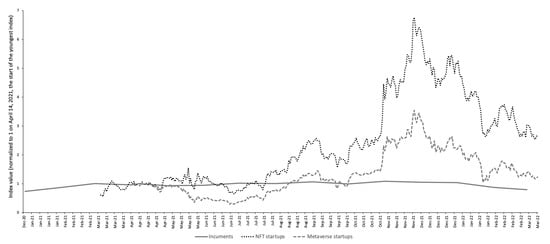 Coinmarketcap’s NFT Index, NFTI). The curves show that both startup categories have larger growth rates than incumbents, suggesting that startups capture relatively more value from the emerging Metaverse economy than incumbents.