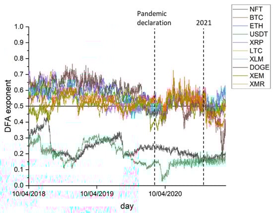 We started our analysis by calculating the DFA with sliding windows, obtaining the results presented in Figure 2. As can be seen, most of the assets under analysis evolved from DFA exponents higher than 0.5 to a pattern at around the 0.5 level. The exceptions are clearly USDT and NFT, which present a strong antipersistent behavior throughout the period under analysis.