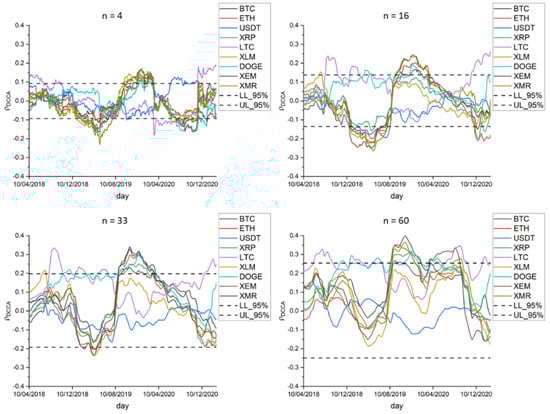 Evolution of the between NFT and the different cryptocurrencies under analysis, for time scales of 4, 16, 33, and 60 days. Dashed lines represent the 95% confidence interval limits, to test the statistical significance of the correlations.