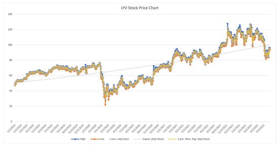 Figure 3 contains the high stock price, low stock price, and the adjusted close price of LYV from 2019 to June 2022. We have also added the average trend line and the exponential trend line for the adjusted closed stock price.
