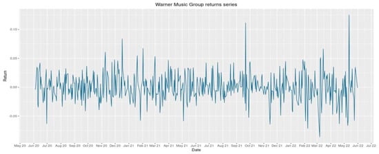 Table 4 shows the summary statistics of WMG log-returns from June 2020 to June 2022. Figure 7 shows the log returns for WMG from June 2020 to June 2022, and we can see that WMG shows mostly negative returns from November 2021 to May 2022. WMG reached very high returns around the end of September 2021 and in the middle of May 2022.
