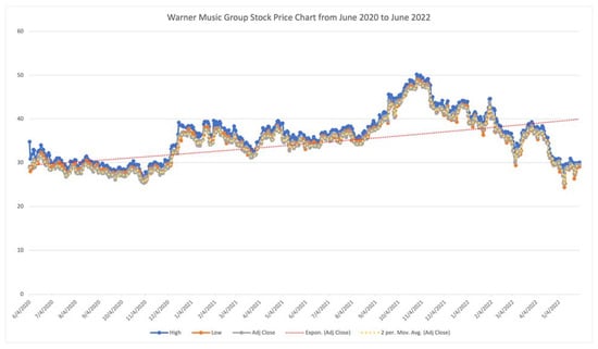 We also created a chart of the WMG stock price, in which we added the trend line of the adjusted stock price and its moving average line. From Figure 8, we can see that the stock price of WMG increased significantly in January and November 2021 and then decreased again. In 2021, there was a significant increase in the stock price of WMG. Benefiting from the coronavirus that changed people’s music listening habits, WMG digital revenues grew by more than 20% in 2021, not only because of increased streaming subscriptions but also because of the increase in subscribers and the fact that they were paying more money [13]. We can observe from the exponential trend line of the adjusted close price that WMG’s stock price is showing an increasing trend, which proves that the future of WMG’s stock market is promising.