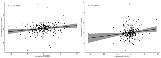 We first studied the relationship between the returns of TME and LYV. To explore whether there was a relationship between the log return of the two companies, we calculated the correlation between them. By comparing the correlation before and after the pandemic, we could observe whether there was a significant effect of the pandemic on live music and recorded music. To make the results more accurate, we chose data from the whole year of 2019 and the whole year of 2021 for the analysis. First, we calculated the linear regression of the TME log return and LYV log return before and after the pandemic. We also used the log return of TME as the predictor variable and the log return of LYV as the response variable. Table 5 shows the output of the linear regression of the TME log return and the LYV log return before the pandemic. The null hypothesis is that there is no linear relationship between the log return of LYV and the log return of TME, and the alternative hypothesis is that there is a linear relationship between the log return of LYV and the log return of TME. Since the p-value is smaller than the 5% significance level, the data are inconsistent with null hypothesis (NH). Therefore, we have evidence to doubt the NH and evidence to support the alternative hypothesis (AH). We have evidence to support that there is a linear relationship between the log return of LYV and the log return of TME. Both the upper and the lower values of the confidence interval are positive, meaning there is evidence the true coefficient is positive, and therefore, there is a positive association between the log return of LYV and the log return of TME. As the log return of TME increases by one unit, the log return of LYV will also increase by 0.1041.