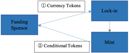 For the second process, the supply side transfers account tokens (①), locks them into the smart contract, then applies the mint function of smart contract to issue the conditional tokens (②) according to Figure 3. The operations are similar to the obligation-type CT.