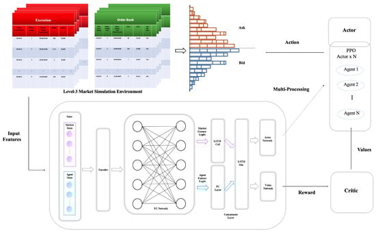 In this study, we mainly utilize the PPO algorithm with a long short-term memory (LSTM) (Hochreiter and Schmidhuber (1997) [19]) network as shown in Figure 1. The architecture of the model is designed to incorporate the RL formulation setup described in Section 2.3. The input features from the simulation environment are provided to the encoders in which the features are encoded into market states and agent states. The market states and agent states are then separately fed into their respective fully connected (FC) layers. Subsequently, the outputs from the market states’ FC layers are concatenated and fed into an LSTM layer along with the hidden state from the previous step. Similarly, the outputs from the agent states’ FC layers are concatenated and fed into an additional FC layer. Then, the two outputs are concatenated as the final output. The final output is used as the input for both the actor and value networks. In the actor network, the final output is fed into two separate FC layers. In the PPO-discrete model, both outputs are subsequently fed into a softmax function, which is used to form a categorical distribution for both the action type and action quantity. In the PPO-hybrid model, one output is similarly fed into a softmax function for the action type, and the other output is directly used to form a normal distribution for continuous action quantity. In the value network, the final output is also fed into an FC layer, which outputs the value. The use of a multiprocessing technique for the actors allows the training time to be reduced by executing processes in parallel. Table A2 provides information on the hyperparmeters used for training the models.