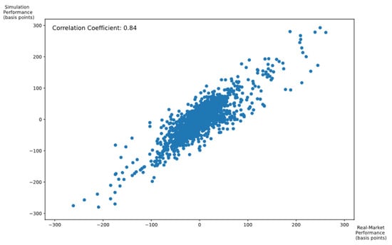 Even with the most granular market data, it is impossible to completely eliminate market impact in the simulation environment, as accurately simulating the behaviors of all market participants in response to the synthetic orders of the agent is infeasible. One of the most accurate ways to evaluate the magnitude of the discrepancy between the simulation environment and the real market is by executing the exact same on the exact same day in both settings separately. One caveat for this approach is that it can only be done ex post. However, since our algorithm was successfully commercialized and used in the real market during the time period of 1 July 2020–29 December 2021, it is possible to replay those in the simulation environment using historical data. Figure 4 demonstrates the strong positive correlation between the performance of the agent for 4332 in the real market and simulation environments. Each data point represents the performance of the agent for the same on the same day in the real market and in the simulation environment. The performance summary of real market executions can also be found in Table A3.