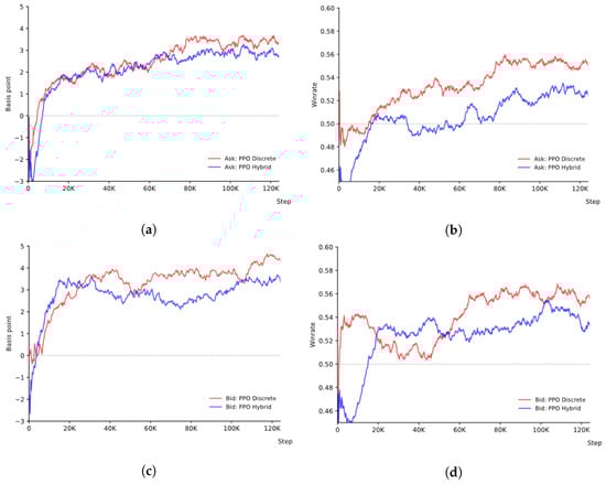 The average win rate represents the ratio of episodes in which the agent outperformed the market VWAP. The x-axis represents the optimization steps during training. In every plot, PPO-discrete is displayed in red, and PPO-hybrid is displayed in blue. As the training progresses, the average performance converges above the basis point of 0 while the average win rate converges above 50% for both the ask and bid sides, with PPO-discrete converging at a slightly higher point than PPO-hybrid in every case. Convergence of the models above the basis point value of 0 and the 50% win rate is substantial as it demonstrates that the models have, on average, learned to outperform the benchmark for 200 execution generated with a random stock sampled from a 50-stock universe, a random execution time horizon between 165 and 380 minutes, and a random target volume.
