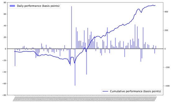 Furthermore, Figure 6 and Figure 7 represent the daily performance of the PPO-discrete model during the validation period. It should be noted that each data point in the bar graphs represents the mean performance of the day across 50 execution . Moreover, the line plots represent the cumulative performance of the model over the validation period. As shown in the figures, for both the ask and bid sides, the final cumulative performance is considerably higher than the basis point of 0. It should also be noted that the y-axis on the left represents the scale of the bar graphs, and the y-axis on the right represents the scale of the line plot.